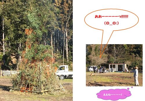 快晴!!! まりふのひとさん、パソコンお仲間さん、地域の皆さんで賑やか&楽しい石八前広場のどんど焼きが行われた。 まりふのひとさんが前日に作られた赤米のお餅(どんど焼き - 山口ばあばの日記さんのブログより)の入ったぜんざい、お仲間さんのいなり…