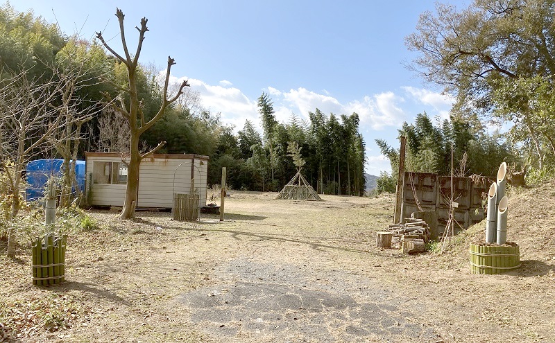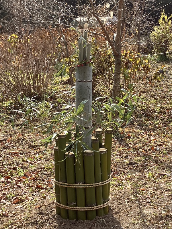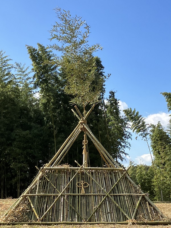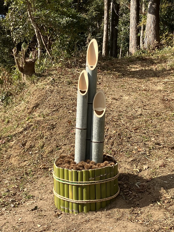 石八前広苑、まりふのひと流 どんど焼きの櫓(制作中)と、門松。